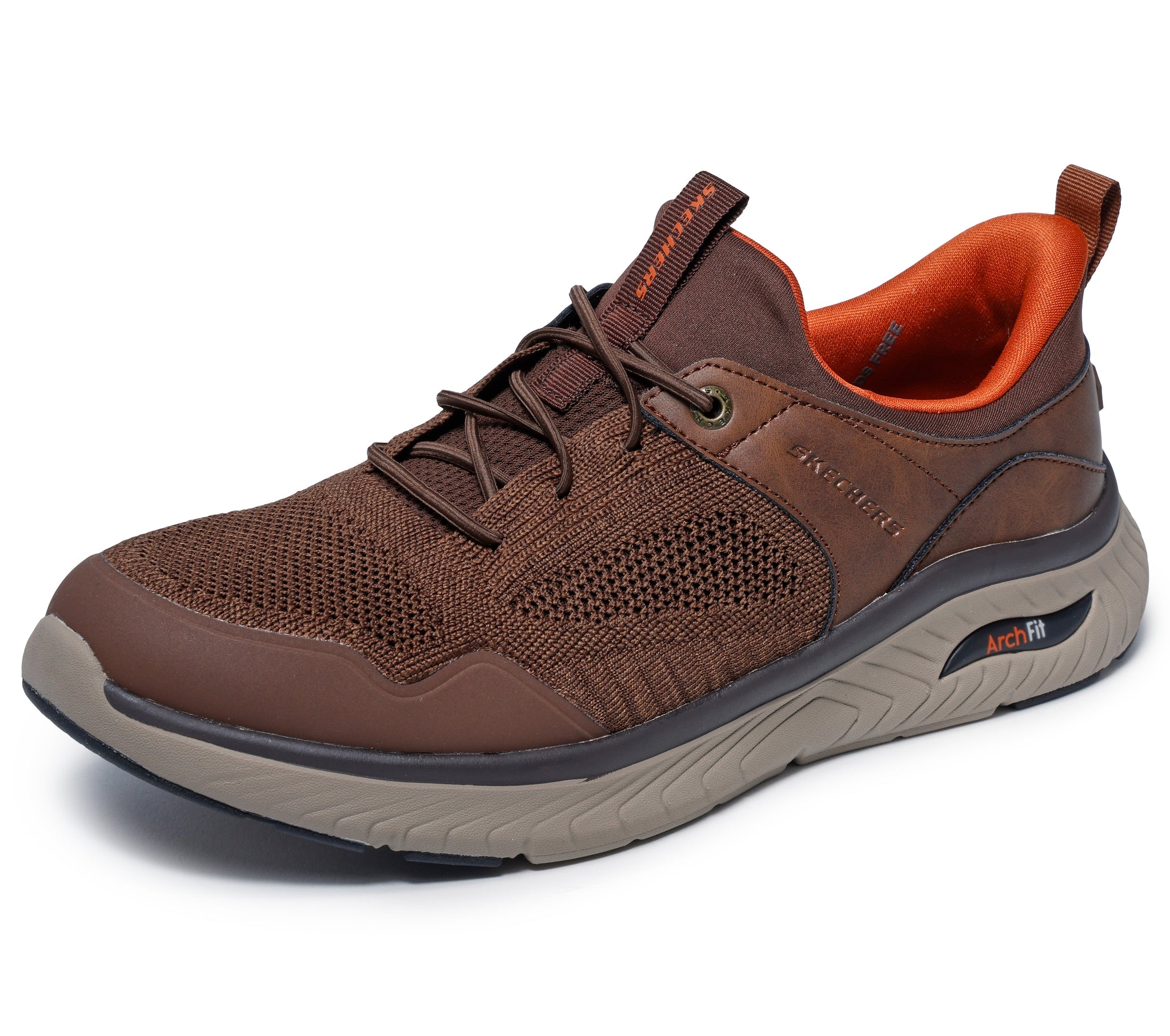 Step into convenient walking comfort with Skechers Slip-ins® Relaxed Fit®: Arch Crosser - Emeric. Designed with our Heel Pillow®, this stretch-laced style features a knitted and synthetic upper with a removable Skechers Arch Fit® insole.