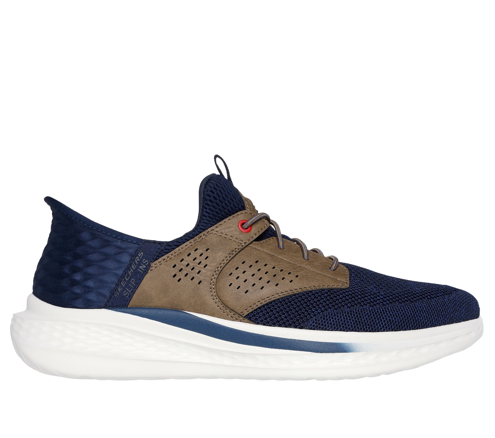 Step into convenient walking comfort with Skechers Slip-ins® Relaxed Fit®: Slade - Caster. Designed with our Heel Pillow®, this stretch-laced style features a mesh and synthetic upper with a charcoal-infused Skechers Air-Cooled Memory Foam® insole and Skechers Goga Mat Arch™ support.