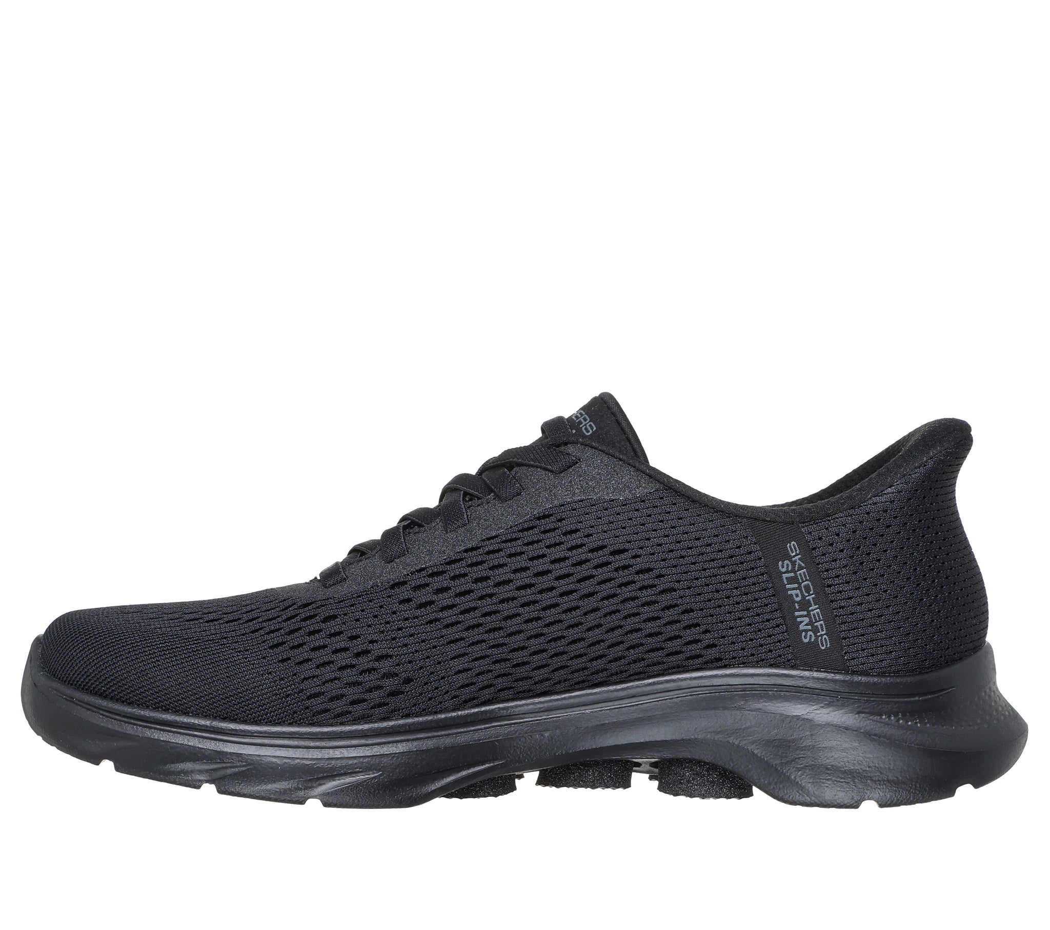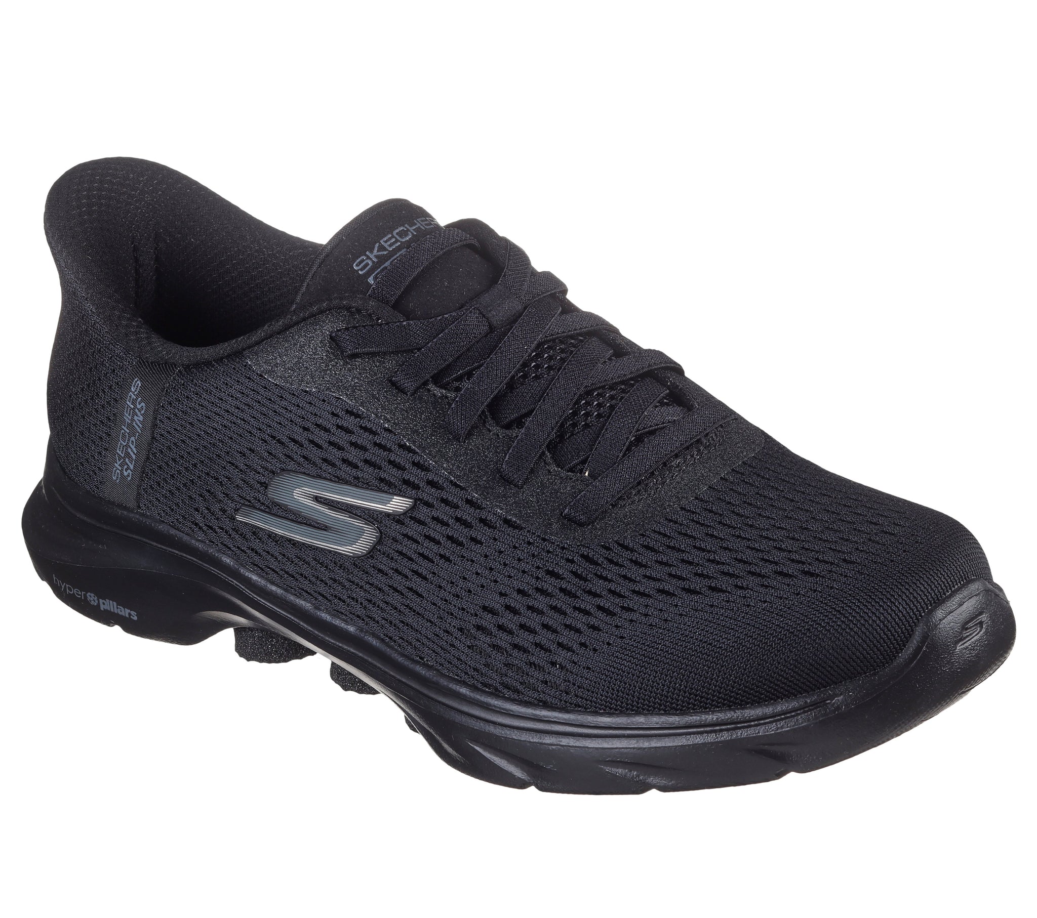 "Walk in easy-wearing comfort with Skechers Hands Free Slip-ins®: GO WALK 7™ - Valin. Designed with our exclusive Heel Pillow™, this hands-free walking slip-on features an engineered mesh upper with a laced front, Skechers Air-Cooled Memory Foam® insole, lightweight ULTRA GO® cushioning, and high-rebound Hyper Pillars™ for added support. "