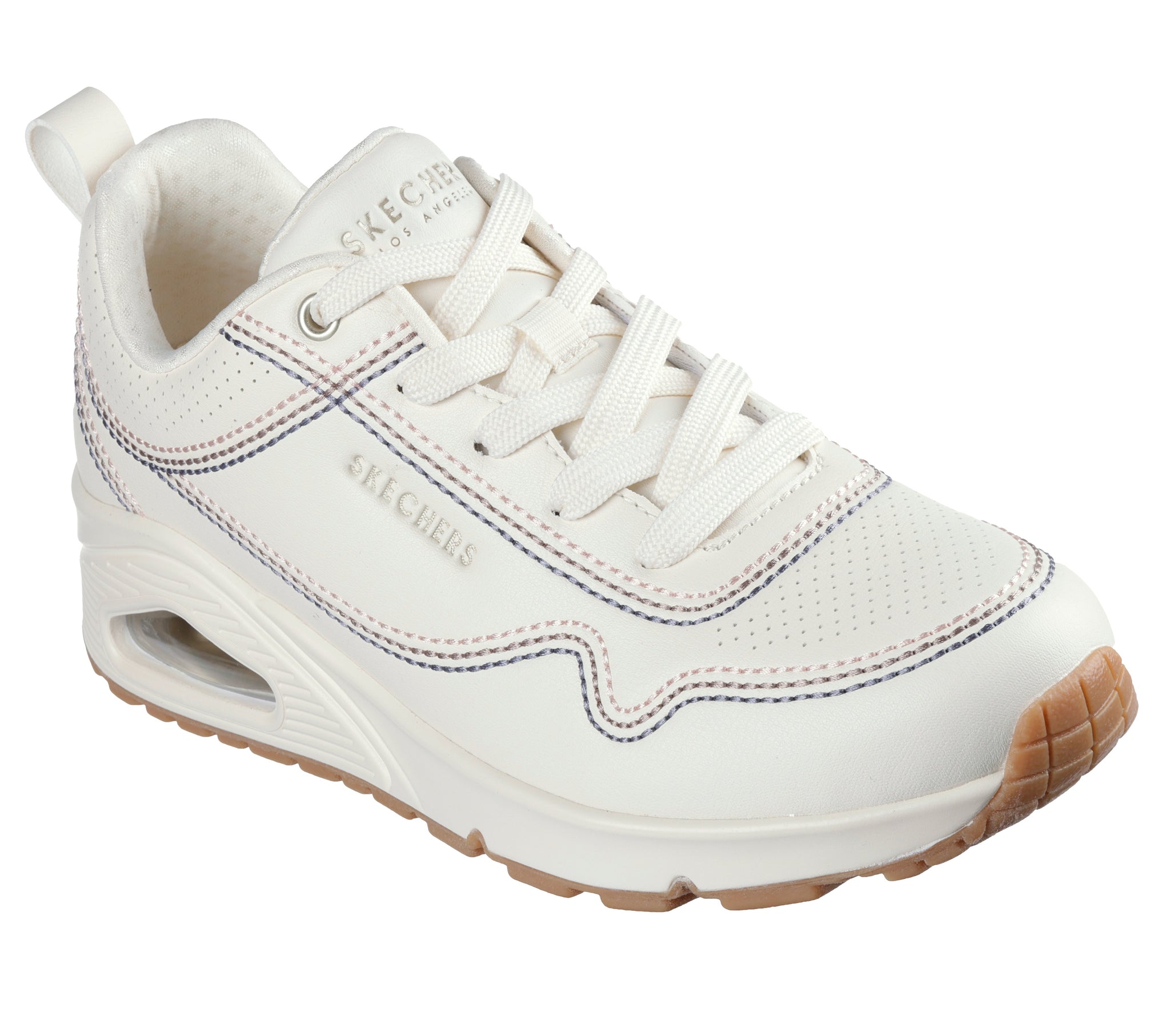 Enjoy classic style with a twist this season with the Skechers Street™ Uno - Luxurious Stitches. This fashionable lace-up sneaker features a synthetic leather upper with contrast stitching details, a Skechers Air-Cooled Memory Foam® insole, and a visible Skech-Air® airbag midsole.