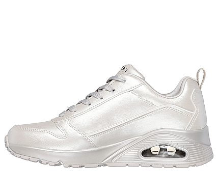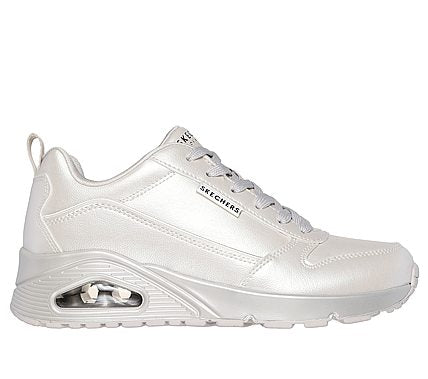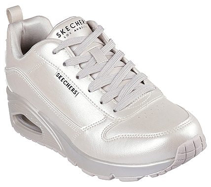 Shine on in fashionable comfort wearing Skechers Street™ Uno - Galactic Gal. This lace-up sneaker features a duraleather upper in a metallic finish with a Skechers Air-Cooled Memory Foam® insole and Skech-Air® visible airbag midsole. SKU: 177104-OFWT