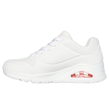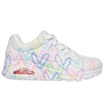 Internationally renowned muralist James Goldcrown brings his iconic #Lovewall heart designs to Skechers in this inspiring collaboration. Show your creative style with the Skechers x JGoldcrown: Skechers Street™ Uno - Spread the Love. This lace-up fashion sneaker features an allover print of the artist's signature heart design that extends to the outsole, synthetic durabuck and perforated trimmed upper with a Skechers Air-Cooled Memory Foam® insole, and a platform wedge with visible Skech-Air® air-cushioned midsole.